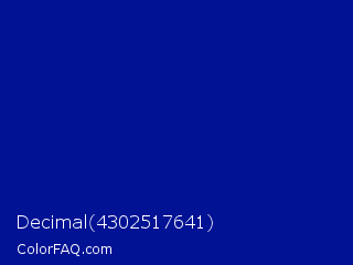 Decimal 4302517641 Color is a dark blue color and the nearest color is Phthalo Blue #000f89. Hex code #011295 and RGB value is rgb(1,18,149). In RGB color space, this color is composed of 0% red, 7% green, 58% blue, In CMYK color space, this color is composed of 99% cyan, 88% magenta, 0% yellow , 42% black , In HSL color space, this color has a hue angle of 233° , 99% saturation and 29% lightness.