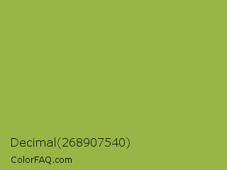 Decimal 268907540 Color is a normal lime color and the nearest color is Android Green #a4c639. Hex code #99b546 and RGB value is rgb(153,181,70). In RGB color space, this color is composed of 60% red, 71% green, 27% blue, In CMYK color space, this color is composed of 15% cyan, 0% magenta, 61% yellow , 29% black , In HSL color space, this color has a hue angle of 75° , 44% saturation and 49% lightness.