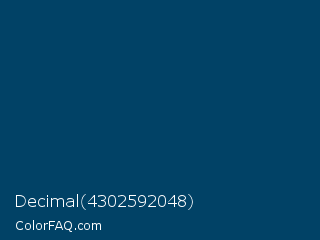 Decimal 4302592048 Color is a very dark blue color and the nearest color is Deep Imperial Blue #00416a. Hex code #014266 and RGB value is rgb(1,66,102). In RGB color space, this color is composed of 0% red, 26% green, 40% blue, In CMYK color space, this color is composed of 99% cyan, 35% magenta, 0% yellow , 60% black , In HSL color space, this color has a hue angle of 201° , 98% saturation and 20% lightness.