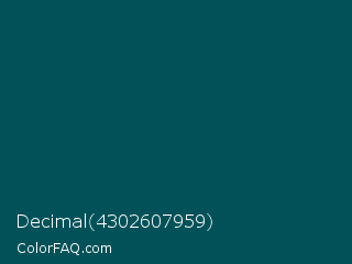 Decimal 4302607959 Color is a very dark cyan color and the nearest color is Midnight Green Eagle Green #004953. Hex code #015159 and RGB value is rgb(1,81,89). In RGB color space, this color is composed of 0% red, 32% green, 35% blue, In CMYK color space, this color is composed of 99% cyan, 9% magenta, 0% yellow , 65% black , In HSL color space, this color has a hue angle of 185° , 98% saturation and 18% lightness.