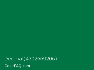 Decimal 4302669206 Color is a dark green color and the nearest color is Dartmouth Green #00703c. Hex code #017444 and RGB value is rgb(1,116,68). In RGB color space, this color is composed of 0% red, 45% green, 27% blue, In CMYK color space, this color is composed of 99% cyan, 0% magenta, 41% yellow , 55% black , In HSL color space, this color has a hue angle of 155° , 98% saturation and 23% lightness.