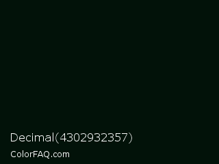 Decimal 4302932357 Color is a almost black green color and the nearest color is Midnight Moss #041004. Hex code #021209 and RGB value is rgb(2,18,9). In RGB color space, this color is composed of 1% red, 7% green, 4% blue, In CMYK color space, this color is composed of 89% cyan, 0% magenta, 50% yellow , 93% black , In HSL color space, this color has a hue angle of 146° , 80% saturation and 4% lightness.