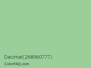 Decimal 268960777 Color is a light green color and the nearest color is Eton Blue #96c8a2. Hex code #99d099 and RGB value is rgb(153,208,153). In RGB color space, this color is composed of 60% red, 82% green, 60% blue, In CMYK color space, this color is composed of 26% cyan, 0% magenta, 26% yellow , 18% black , In HSL color space, this color has a hue angle of 120° , 37% saturation and 71% lightness.