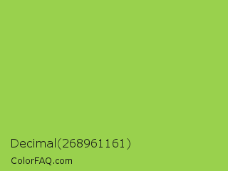 Decimal 268961161 Color is a normal green color and the nearest color is Conifer #acdd4d. Hex code #99d14d and RGB value is rgb(153,209,77). In RGB color space, this color is composed of 60% red, 82% green, 30% blue, In CMYK color space, this color is composed of 27% cyan, 0% magenta, 63% yellow , 18% black , In HSL color space, this color has a hue angle of 85° , 59% saturation and 56% lightness.