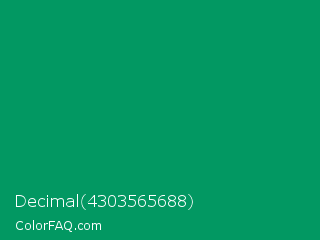 Decimal 4303565688 Color is a dark green color and the nearest color is Green Cyan #009966. Hex code #029862 and RGB value is rgb(2,152,98). In RGB color space, this color is composed of 1% red, 60% green, 38% blue, In CMYK color space, this color is composed of 99% cyan, 0% magenta, 36% yellow , 40% black , In HSL color space, this color has a hue angle of 158° , 97% saturation and 30% lightness.