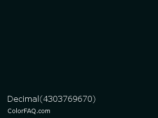 Decimal 4303769670 Color is a almost black cyan color and the nearest color is Blue Charcoal #010d1a. Hex code #031416 and RGB value is rgb(3,20,22). In RGB color space, this color is composed of 1% red, 8% green, 9% blue, In CMYK color space, this color is composed of 86% cyan, 9% magenta, 0% yellow , 91% black , In HSL color space, this color has a hue angle of 186° , 76% saturation and 5% lightness.