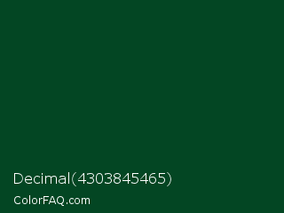 Decimal 4303845465 Color is a very dark green color and the nearest color is Forest Green #014421. Hex code #034623 and RGB value is rgb(3,70,35). In RGB color space, this color is composed of 1% red, 27% green, 14% blue, In CMYK color space, this color is composed of 96% cyan, 0% magenta, 50% yellow , 73% black , In HSL color space, this color has a hue angle of 149° , 92% saturation and 14% lightness.