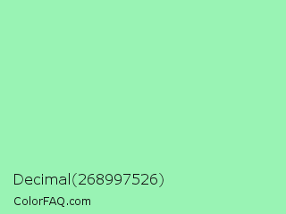 Decimal 268997526 Color is a light green color and the nearest color is Teal Deer #99e6b3. Hex code #99f3b4 and RGB value is rgb(153,243,180). In RGB color space, this color is composed of 60% red, 95% green, 71% blue, In CMYK color space, this color is composed of 37% cyan, 0% magenta, 26% yellow , 5% black , In HSL color space, this color has a hue angle of 138° , 79% saturation and 78% lightness.