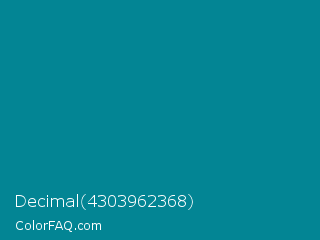 Decimal 4303962368 Color is a dark cyan color and the nearest color is Blue Chill #0c8990. Hex code #038594 and RGB value is rgb(3,133,148). In RGB color space, this color is composed of 1% red, 52% green, 58% blue, In CMYK color space, this color is composed of 98% cyan, 10% magenta, 0% yellow , 42% black , In HSL color space, this color has a hue angle of 186° , 96% saturation and 30% lightness.