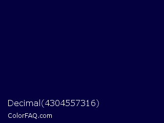 Decimal 4304557316 Color is a very dark indigo color and the nearest color is Stratos #000741. Hex code #040040 and RGB value is rgb(4,0,64). In RGB color space, this color is composed of 2% red, 0% green, 25% blue, In CMYK color space, this color is composed of 94% cyan, 100% magenta, 0% yellow , 75% black , In HSL color space, this color has a hue angle of 244° , 100% saturation and 13% lightness.