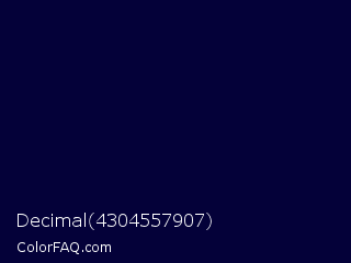 Decimal 4304557907 Color is a very dark indigo color and the nearest color is Stratos #000741. Hex code #040139 and RGB value is rgb(4,1,57). In RGB color space, this color is composed of 2% red, 0% green, 22% blue, In CMYK color space, this color is composed of 93% cyan, 98% magenta, 0% yellow , 78% black , In HSL color space, this color has a hue angle of 243° , 97% saturation and 11% lightness.