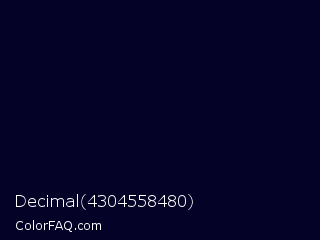 Decimal 4304558480 Color is a almost black indigo color and the nearest color is Black Russian #0a001c. Hex code #040226 and RGB value is rgb(4,2,38). In RGB color space, this color is composed of 2% red, 1% green, 15% blue, In CMYK color space, this color is composed of 89% cyan, 95% magenta, 0% yellow , 85% black , In HSL color space, this color has a hue angle of 243° , 90% saturation and 8% lightness.