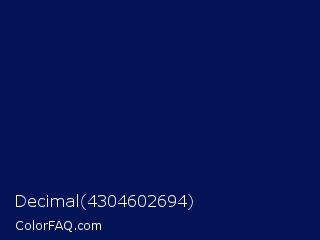Decimal 4304602694 Color is a very dark blue color and the nearest color is Gulf Blue #051657. Hex code #041456 and RGB value is rgb(4,20,86). In RGB color space, this color is composed of 2% red, 8% green, 34% blue, In CMYK color space, this color is composed of 95% cyan, 77% magenta, 0% yellow , 66% black , In HSL color space, this color has a hue angle of 228° , 91% saturation and 18% lightness.