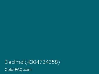 Decimal 4304734358 Color is a dark cyan color and the nearest color is Mosque #036a6e. Hex code #046370 and RGB value is rgb(4,99,112). In RGB color space, this color is composed of 2% red, 39% green, 44% blue, In CMYK color space, this color is composed of 96% cyan, 12% magenta, 0% yellow , 56% black , In HSL color space, this color has a hue angle of 187° , 93% saturation and 23% lightness.