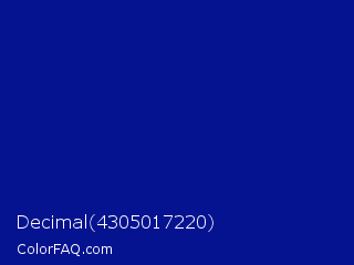 Decimal 4305017220 Color is a dark blue color and the nearest color is Phthalo Blue #000f89. Hex code #051390 and RGB value is rgb(5,19,144). In RGB color space, this color is composed of 2% red, 7% green, 56% blue, In CMYK color space, this color is composed of 97% cyan, 87% magenta, 0% yellow , 44% black , In HSL color space, this color has a hue angle of 234° , 93% saturation and 29% lightness.