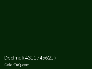 Decimal 4311745621 Color is a almost black green color and the nearest color is Palm Green #09230f. Hex code #052507 and RGB value is rgb(5,37,7). In RGB color space, this color is composed of 2% red, 15% green, 3% blue, In CMYK color space, this color is composed of 86% cyan, 0% magenta, 81% yellow , 85% black , In HSL color space, this color has a hue angle of 124° , 76% saturation and 8% lightness.