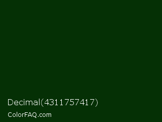 Decimal 4311757417 Color is a very dark green color and the nearest color is Deep Fir #002900. Hex code #053005 and RGB value is rgb(5,48,5). In RGB color space, this color is composed of 2% red, 19% green, 2% blue, In CMYK color space, this color is composed of 90% cyan, 0% magenta, 90% yellow , 81% black , In HSL color space, this color has a hue angle of 120° , 81% saturation and 10% lightness.