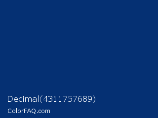 Decimal 4311757689 Color is a dark blue color and the nearest color is Catalina Blue #062a78. Hex code #053073 and RGB value is rgb(5,48,115). In RGB color space, this color is composed of 2% red, 19% green, 45% blue, In CMYK color space, this color is composed of 96% cyan, 58% magenta, 0% yellow , 55% black , In HSL color space, this color has a hue angle of 217° , 92% saturation and 24% lightness.