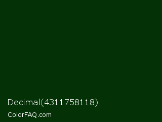 Decimal 4311758118 Color is a very dark green color and the nearest color is Deep Fir #002900. Hex code #053106 and RGB value is rgb(5,49,6). In RGB color space, this color is composed of 2% red, 19% green, 2% blue, In CMYK color space, this color is composed of 90% cyan, 0% magenta, 88% yellow , 81% black , In HSL color space, this color has a hue angle of 121° , 81% saturation and 11% lightness.