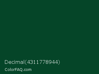 Decimal 4311778944 Color is a very dark green color and the nearest color is British Racing Green #004225. Hex code #054528 and RGB value is rgb(5,69,40). In RGB color space, this color is composed of 2% red, 27% green, 16% blue, In CMYK color space, this color is composed of 93% cyan, 0% magenta, 42% yellow , 73% black , In HSL color space, this color has a hue angle of 153° , 86% saturation and 15% lightness.
