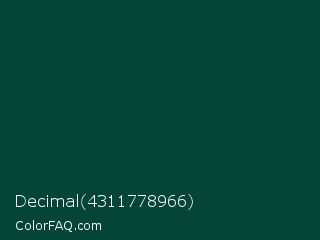 Decimal 4311778966 Color is a very dark cyan color and the nearest color is Rich Black #004040. Hex code #054538 and RGB value is rgb(5,69,56). In RGB color space, this color is composed of 2% red, 27% green, 22% blue, In CMYK color space, this color is composed of 93% cyan, 0% magenta, 19% yellow , 73% black , In HSL color space, this color has a hue angle of 168° , 86% saturation and 15% lightness.