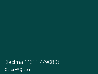 Decimal 4311779080 Color is a very dark cyan color and the nearest color is Warm Black #004242. Hex code #054544 and RGB value is rgb(5,69,68). In RGB color space, this color is composed of 2% red, 27% green, 27% blue, In CMYK color space, this color is composed of 93% cyan, 0% magenta, 1% yellow , 73% black , In HSL color space, this color has a hue angle of 179° , 86% saturation and 15% lightness.