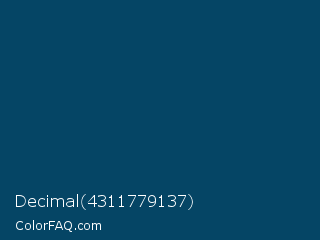 Decimal 4311779137 Color is a very dark blue color and the nearest color is Deep Imperial Blue #00416a. Hex code #054565 and RGB value is rgb(5,69,101). In RGB color space, this color is composed of 2% red, 27% green, 40% blue, In CMYK color space, this color is composed of 95% cyan, 32% magenta, 0% yellow , 60% black , In HSL color space, this color has a hue angle of 200° , 91% saturation and 21% lightness.