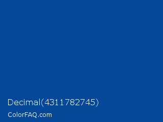 Decimal 4311782745 Color is a normal blue color and the nearest color is Medium Electric Blue #035096. Hex code #054897 and RGB value is rgb(5,72,151). In RGB color space, this color is composed of 2% red, 28% green, 59% blue, In CMYK color space, this color is composed of 97% cyan, 52% magenta, 0% yellow , 41% black , In HSL color space, this color has a hue angle of 212° , 94% saturation and 31% lightness.