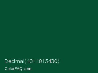Decimal 4311815430 Color is a very dark green color and the nearest color is Sacramento State Green #00563f. Hex code #055032 and RGB value is rgb(5,80,50). In RGB color space, this color is composed of 2% red, 31% green, 20% blue, In CMYK color space, this color is composed of 94% cyan, 0% magenta, 38% yellow , 69% black , In HSL color space, this color has a hue angle of 156° , 88% saturation and 17% lightness.