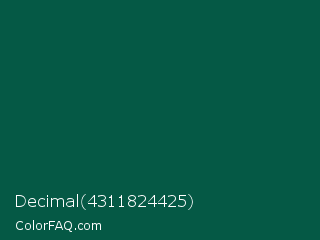 Decimal 4311824425 Color is a very dark cyan color and the nearest color is Sacramento State Green #00563f. Hex code #055945 and RGB value is rgb(5,89,69). In RGB color space, this color is composed of 2% red, 35% green, 27% blue, In CMYK color space, this color is composed of 94% cyan, 0% magenta, 22% yellow , 65% black , In HSL color space, this color has a hue angle of 166° , 89% saturation and 18% lightness.