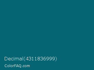 Decimal 4311836999 Color is a dark cyan color and the nearest color is Mosque #036a6e. Hex code #056573 and RGB value is rgb(5,101,115). In RGB color space, this color is composed of 2% red, 40% green, 45% blue, In CMYK color space, this color is composed of 96% cyan, 12% magenta, 0% yellow , 55% black , In HSL color space, this color has a hue angle of 188° , 92% saturation and 24% lightness.