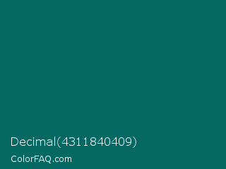 Decimal 4311840409 Color is a very dark cyan color and the nearest color is Blue Stone #016162. Hex code #056863 and RGB value is rgb(5,104,99). In RGB color space, this color is composed of 2% red, 41% green, 39% blue, In CMYK color space, this color is composed of 95% cyan, 0% magenta, 5% yellow , 59% black , In HSL color space, this color has a hue angle of 177° , 91% saturation and 21% lightness.
