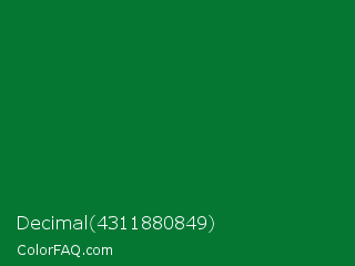 Decimal 4311880849 Color is a dark green color and the nearest color is La Salle Green #087830. Hex code #057733 and RGB value is rgb(5,119,51). In RGB color space, this color is composed of 2% red, 47% green, 20% blue, In CMYK color space, this color is composed of 96% cyan, 0% magenta, 57% yellow , 53% black , In HSL color space, this color has a hue angle of 144° , 92% saturation and 24% lightness.