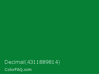 Decimal 4311889814 Color is a dark green color and the nearest color is La Salle Green #087830. Hex code #058034 and RGB value is rgb(5,128,52). In RGB color space, this color is composed of 2% red, 50% green, 20% blue, In CMYK color space, this color is composed of 96% cyan, 0% magenta, 59% yellow , 50% black , In HSL color space, this color has a hue angle of 143° , 92% saturation and 26% lightness.