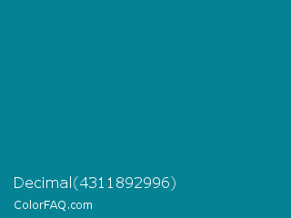 Decimal 4311892996 Color is a dark cyan color and the nearest color is Metallic Seaweed #0a7e8c. Hex code #058294 and RGB value is rgb(5,130,148). In RGB color space, this color is composed of 2% red, 51% green, 58% blue, In CMYK color space, this color is composed of 97% cyan, 12% magenta, 0% yellow , 42% black , In HSL color space, this color has a hue angle of 188° , 93% saturation and 30% lightness.
