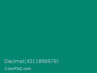 Decimal 4311896979 Color is a dark cyan color and the nearest color is Observatory #02866f. Hex code #058671 and RGB value is rgb(5,134,113). In RGB color space, this color is composed of 2% red, 53% green, 44% blue, In CMYK color space, this color is composed of 96% cyan, 0% magenta, 16% yellow , 47% black , In HSL color space, this color has a hue angle of 170° , 93% saturation and 27% lightness.