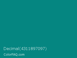 Decimal 4311897097 Color is a dark cyan color and the nearest color is Teal Green #00827f. Hex code #058681 and RGB value is rgb(5,134,129). In RGB color space, this color is composed of 2% red, 53% green, 51% blue, In CMYK color space, this color is composed of 96% cyan, 0% magenta, 4% yellow , 47% black , In HSL color space, this color has a hue angle of 178° , 93% saturation and 27% lightness.
