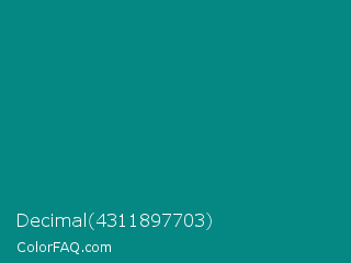 Decimal 4311897703 Color is a dark cyan color and the nearest color is Teal Green #00827f. Hex code #058783 and RGB value is rgb(5,135,131). In RGB color space, this color is composed of 2% red, 53% green, 51% blue, In CMYK color space, this color is composed of 96% cyan, 0% magenta, 3% yellow , 47% black , In HSL color space, this color has a hue angle of 178° , 93% saturation and 27% lightness.