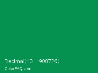 Decimal 4311908726 Color is a dark green color and the nearest color is Spanish Green #009150. Hex code #059150 and RGB value is rgb(5,145,80). In RGB color space, this color is composed of 2% red, 57% green, 31% blue, In CMYK color space, this color is composed of 97% cyan, 0% magenta, 45% yellow , 43% black , In HSL color space, this color has a hue angle of 152° , 93% saturation and 29% lightness.