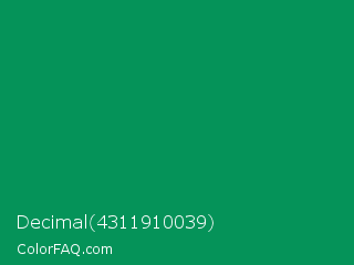 Decimal 4311910039 Color is a dark green color and the nearest color is Spanish Green #009150. Hex code #059359 and RGB value is rgb(5,147,89). In RGB color space, this color is composed of 2% red, 58% green, 35% blue, In CMYK color space, this color is composed of 97% cyan, 0% magenta, 39% yellow , 42% black , In HSL color space, this color has a hue angle of 155° , 93% saturation and 30% lightness.