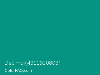 Decimal 4311910803 Color is a dark cyan color and the nearest color is Gossamer #069b81. Hex code #059481 and RGB value is rgb(5,148,129). In RGB color space, this color is composed of 2% red, 58% green, 51% blue, In CMYK color space, this color is composed of 97% cyan, 0% magenta, 13% yellow , 42% black , In HSL color space, this color has a hue angle of 172° , 93% saturation and 30% lightness.