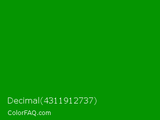 Decimal 4311912737 Color is a dark green color and the nearest color is Islamic Green #009000. Hex code #059501 and RGB value is rgb(5,149,1). In RGB color space, this color is composed of 2% red, 58% green, 0% blue, In CMYK color space, this color is composed of 97% cyan, 0% magenta, 99% yellow , 42% black , In HSL color space, this color has a hue angle of 118° , 99% saturation and 29% lightness.