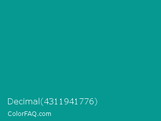 Decimal 4311941776 Color is a normal cyan color and the nearest color is Viridian Green #009698. Hex code #059992 and RGB value is rgb(5,153,146). In RGB color space, this color is composed of 2% red, 60% green, 57% blue, In CMYK color space, this color is composed of 97% cyan, 0% magenta, 5% yellow , 40% black , In HSL color space, this color has a hue angle of 177° , 94% saturation and 31% lightness.