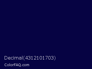Decimal 4312101703 Color is a very dark indigo color and the nearest color is Stratos #000741. Hex code #060343 and RGB value is rgb(6,3,67). In RGB color space, this color is composed of 2% red, 1% green, 26% blue, In CMYK color space, this color is composed of 91% cyan, 96% magenta, 0% yellow , 74% black , In HSL color space, this color has a hue angle of 243° , 91% saturation and 14% lightness.