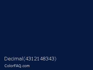 Decimal 4312148343 Color is a very dark blue color and the nearest color is Tangaroa #03163c. Hex code #061941 and RGB value is rgb(6,25,65). In RGB color space, this color is composed of 2% red, 10% green, 25% blue, In CMYK color space, this color is composed of 91% cyan, 62% magenta, 0% yellow , 75% black , In HSL color space, this color has a hue angle of 221° , 83% saturation and 14% lightness.