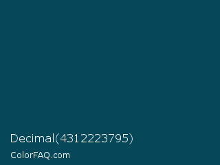 Decimal 4312223795 Color is a very dark cyan color and the nearest color is Teal Blue #044259. Hex code #064859 and RGB value is rgb(6,72,89). In RGB color space, this color is composed of 2% red, 28% green, 35% blue, In CMYK color space, this color is composed of 93% cyan, 19% magenta, 0% yellow , 65% black , In HSL color space, this color has a hue angle of 192° , 87% saturation and 19% lightness.