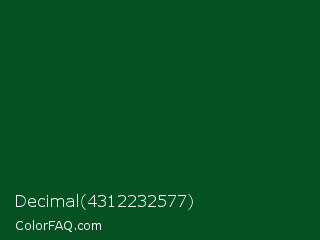 Decimal 4312232577 Color is a very dark green color and the nearest color is Camarone #00581a. Hex code #065121 and RGB value is rgb(6,81,33). In RGB color space, this color is composed of 2% red, 32% green, 13% blue, In CMYK color space, this color is composed of 93% cyan, 0% magenta, 59% yellow , 68% black , In HSL color space, this color has a hue angle of 142° , 86% saturation and 17% lightness.
