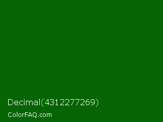 Decimal 4312277269 Color is a very dark green color and the nearest color is Deep Green #056608. Hex code #066403 and RGB value is rgb(6,100,3). In RGB color space, this color is composed of 2% red, 39% green, 1% blue, In CMYK color space, this color is composed of 94% cyan, 0% magenta, 97% yellow , 61% black , In HSL color space, this color has a hue angle of 118° , 94% saturation and 20% lightness.