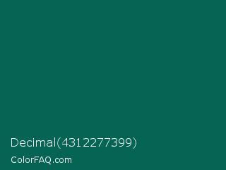 Decimal 4312277399 Color is a very dark cyan color and the nearest color is Bottle Green #006a4e. Hex code #066455 and RGB value is rgb(6,100,85). In RGB color space, this color is composed of 2% red, 39% green, 33% blue, In CMYK color space, this color is composed of 94% cyan, 0% magenta, 15% yellow , 61% black , In HSL color space, this color has a hue angle of 170° , 89% saturation and 21% lightness.