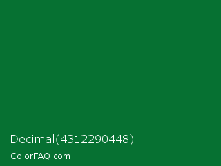 Decimal 4312290448 Color is a dark green color and the nearest color is La Salle Green #087830. Hex code #067132 and RGB value is rgb(6,113,50). In RGB color space, this color is composed of 2% red, 44% green, 20% blue, In CMYK color space, this color is composed of 95% cyan, 0% magenta, 56% yellow , 56% black , In HSL color space, this color has a hue angle of 145° , 90% saturation and 23% lightness.